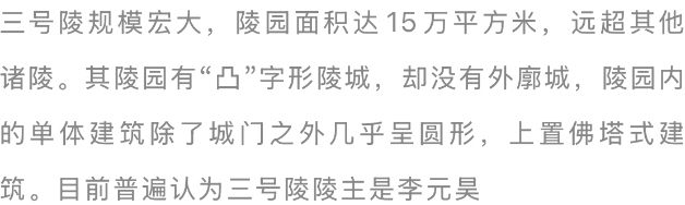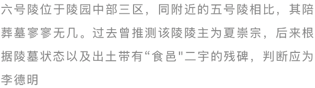 这下许多问题便迎刃而解了:嘉陵建于泰陵之前,当时西夏刚刚建立不久,实力尚弱,所以地表建筑稍显简朴也情有可原;更重要的是六号陵附近只有几座陪葬墓,考虑到李德明生前并未称帝,这事便显得十分合理了。