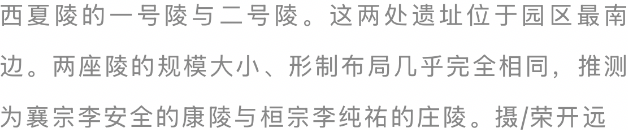 显然,到明初时西夏陵中有价值的陪葬品早已被蒙古大军和随后而来的盗墓者们搜刮一空了,剩下的不过是断瓦残垣与夯土构筑成的陵塔和土墙。此后几百年间,陆续有人至此挖土取砖,将王陵的最后一点价值也彻底榨干,渐渐地风沙掩埋了昔日的帝陵。除高达十几甚至二十几米的夯土陵塔还能露出地表外,陵园边界都已模糊不清。到1971年冬,考古学者在遗址附近发现西夏文残碑块,最终将这片陵区确认为西夏陵时,这里已经衰败到无法想象了。